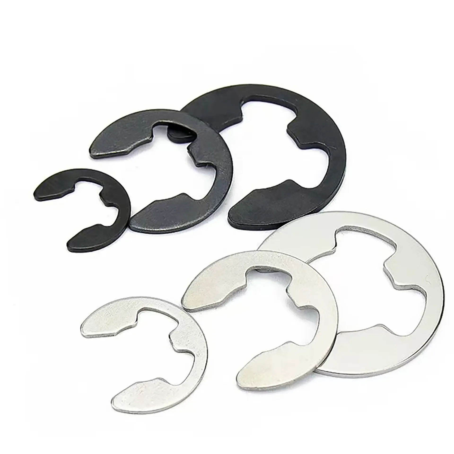 The E-type retaining ring (snap ring) is a mechanical component used on shaft ends to prevent axial movement of parts. It conforms to the GB896 standard, is made of stainless steel or carbon steel, and is available in a wide range of specifications.