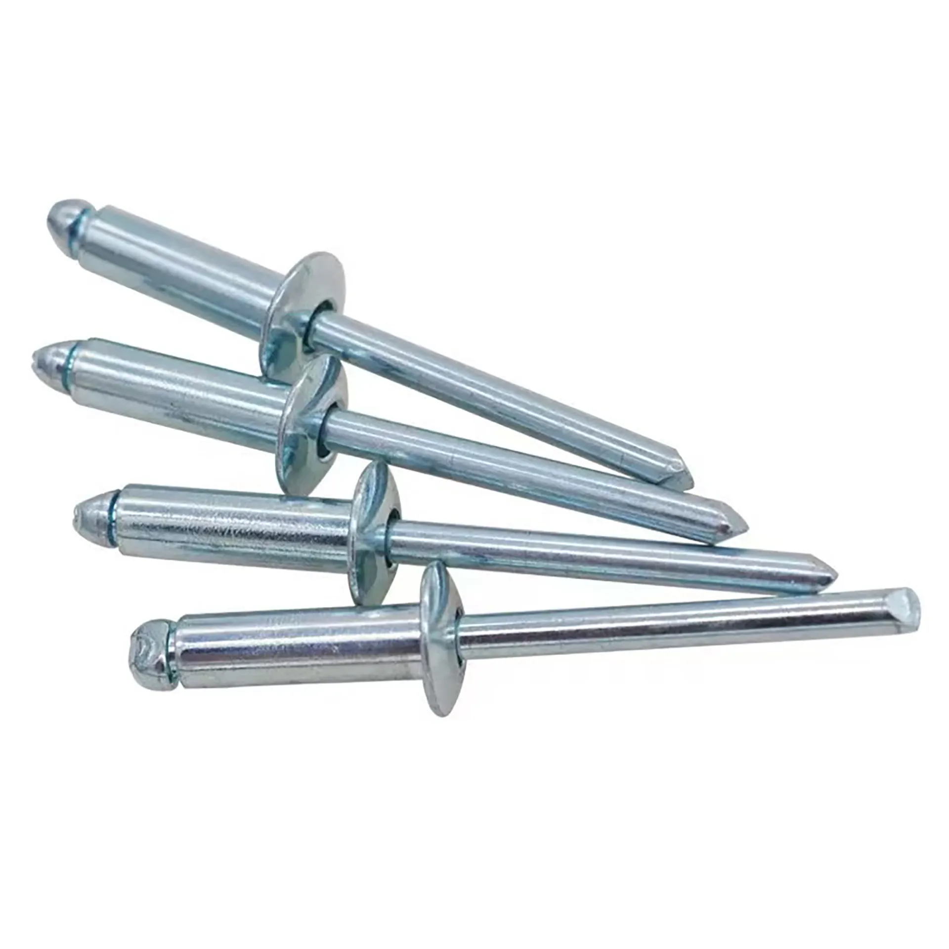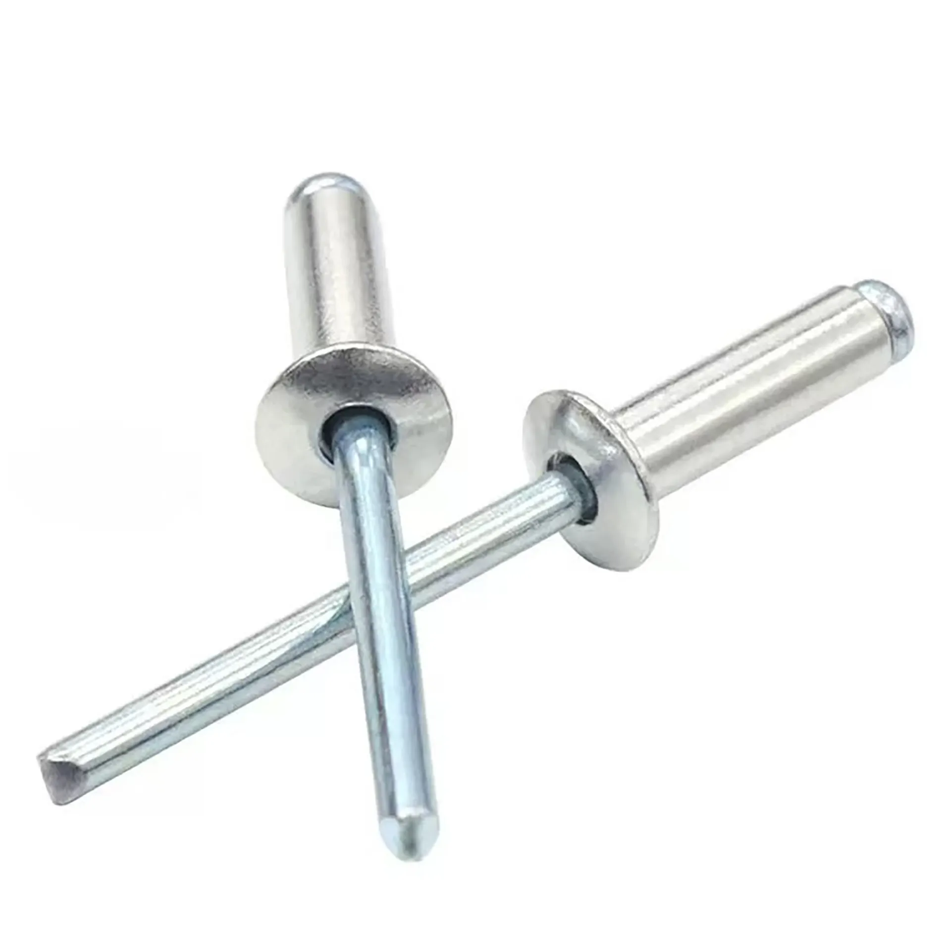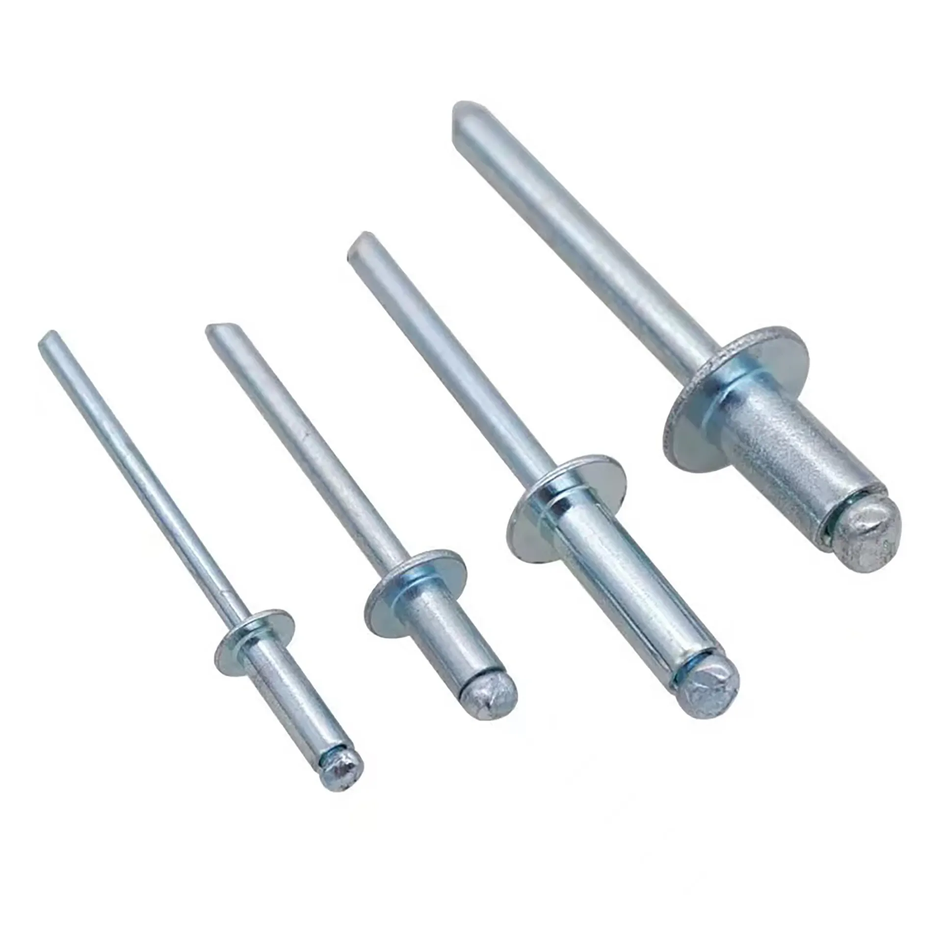 Blind rivets are particularly suitable for situations where riveting operations can only be performed from one side of the workpiece. The rivet is placed in a pre-drilled hole, and a matching riveting tool pulls the nail core. This causes the head of the nail core to be drawn into the rivet body, deforming the rivet body and causing it to expand on the back side to achieve fixation. When the head of the nail core reaches the surface of the backside material, its movement is obstructed, creating resistance. The nail core then separates at a predetermined breaking point under a set breaking force. The secure connection formed by the rivet body remains intact, with the retained portion of the nail head and the rivet body fixed together on the back side, while the broken portion of the nail core is ejected.